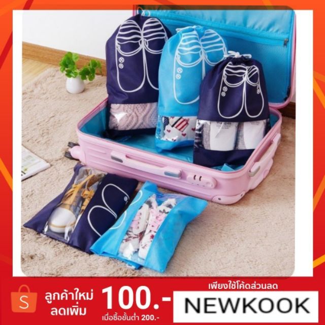 ถุงใส่รองเท้ากีฬา ส้นสูง คัทชู แบบหูรูด ใช้ใส่รองเท้าเวลาเดินทาง และ เก็บกับฝุ่นทำให้เป็นระเบียบและสะอาดทั้งเวลาเดินทาง และที่บ้าน ขนย้ายรองเท้าได้อย่างสะดวก และทำให้รองเท้าไม่ไปเลอะของอื่นๆ มีช่องหน้าต่างด้านหน้า ทำให้เก็นรองเท้าที่เก็บอยู่ด้านใน เนื้อผ้าระบายอาการศได้ดี ป้องกันสัตว์และแมลงต่างๆที่สามารถเข้ามาอยู่ในรองเท้าได้ สามารถซักล้างทำความสะอาดได้ นอกจากใส่รองเท้าแล้วยังสามารถนำมาใส่ของอื่นๆได้ด้วย เช่น เสื้อผ้า ชุดชั้นใน ผ้าขนหนู วัสดุทำจาก ผ้าสปันบอนด์ (Spunbond) มี 2 ขนาด ขนาดเล็ก (Small) 27 35 cm ขนาดใหญ่ (Big) 32 44 cm ใส่ได้ 2 คู่ มี 2 สี สีฟ้า Sky Blue สีกรม Navy