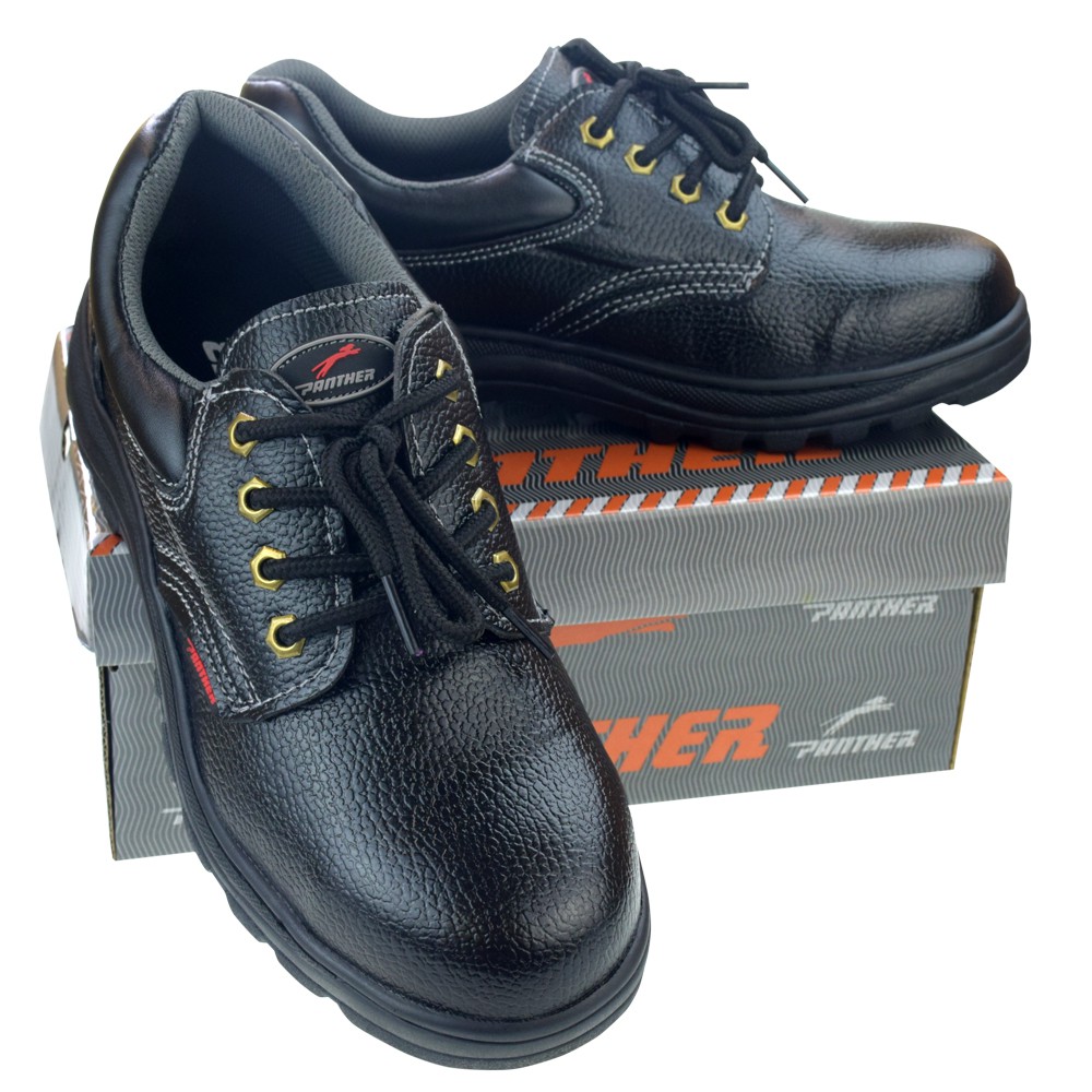 รองเท้าเซฟตี้ รุ่น Panther BOLT - พื้นยางบิวทาไดอีน ผสมยางไนไตรล์ กันน้ำมัน กันกรดด่าง - ลายพื้นรองเท้า กันลื่นได้ดีเยี่ยม - ผลิตจากหนังเทียม พียู ผิวอัดลาย คุณภาพสูง ไม่เป็นรอยง่าย แม้นั่งยองๆ - หัวเหล็กแบบกว้างพิเศษ ได้รับการประทับตรา EN 12568 (มอก.523-2554 ใช้ตามมาตรฐานนี้) - หัวเหล็กรับแรงกระแทกได้ 200 จูล และแรงกดทับ 15,000 นิวตัน - มีแผ่นเหล็ก เสริม ป้องกันการแทงทะลุ จากตะปู หรือของมีคม - แผ่นรองเท้า EVA ด้านใน หนานุ่ม พิเศษ อายุงานนานนับปี - ผ้าซับรอบรองเท้า ผลิตจาก Nylon 200D เกรดคุณภาพ อายุงานยาวนาน ทนทาน เชือกรองเท้าทนทาน เหมาะกับงานโรงงาน ปิโตรเคมี งานที่ต้องเลอะน้ำมัน งานซ่อมบำรุง เหมาะกับงาน ที่ต้องการป้องกันการลื่น ทนทาน ในงบประมาณที่จำกัด รองเท้าเซฟตี้ รองเท้านิรภัย รองเท้าหัวเหล็ก รองเท้าโรงงาน